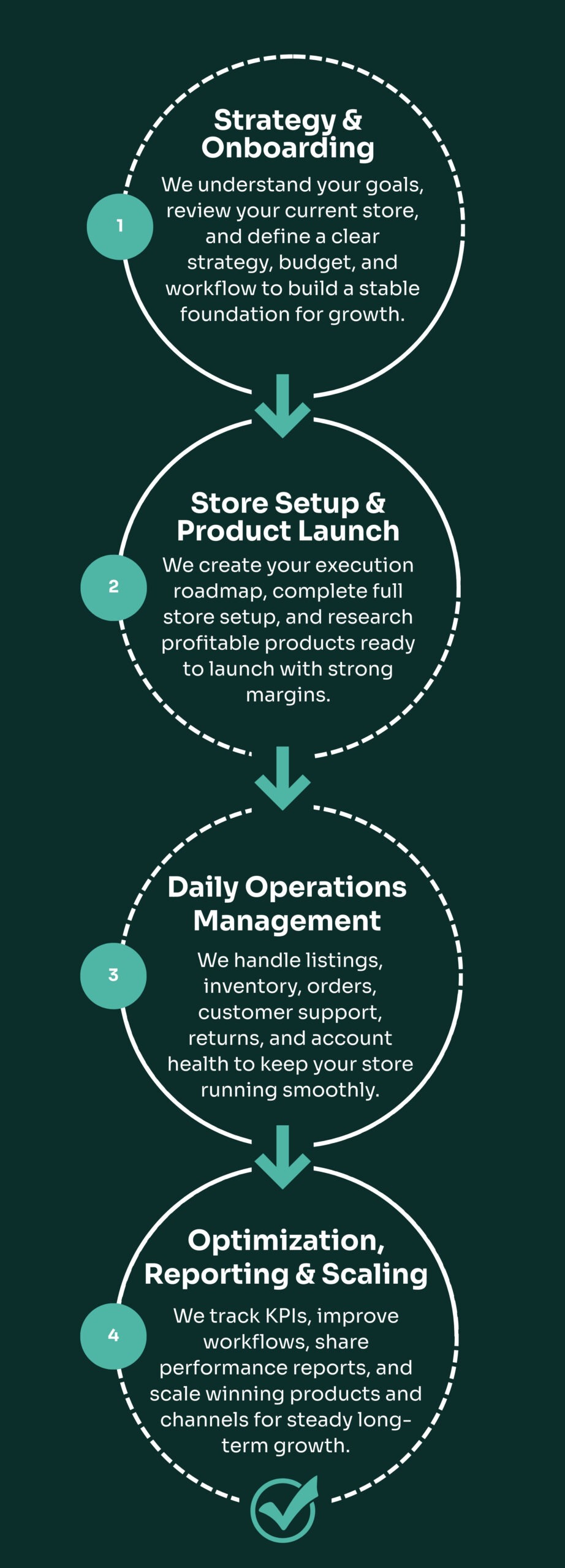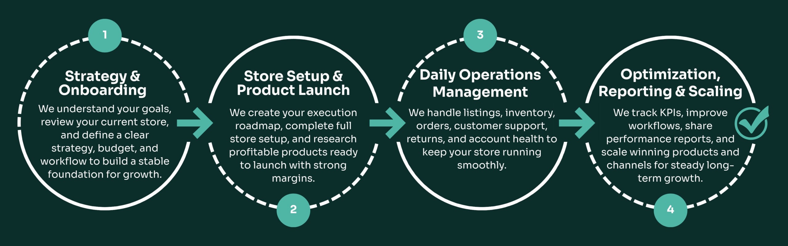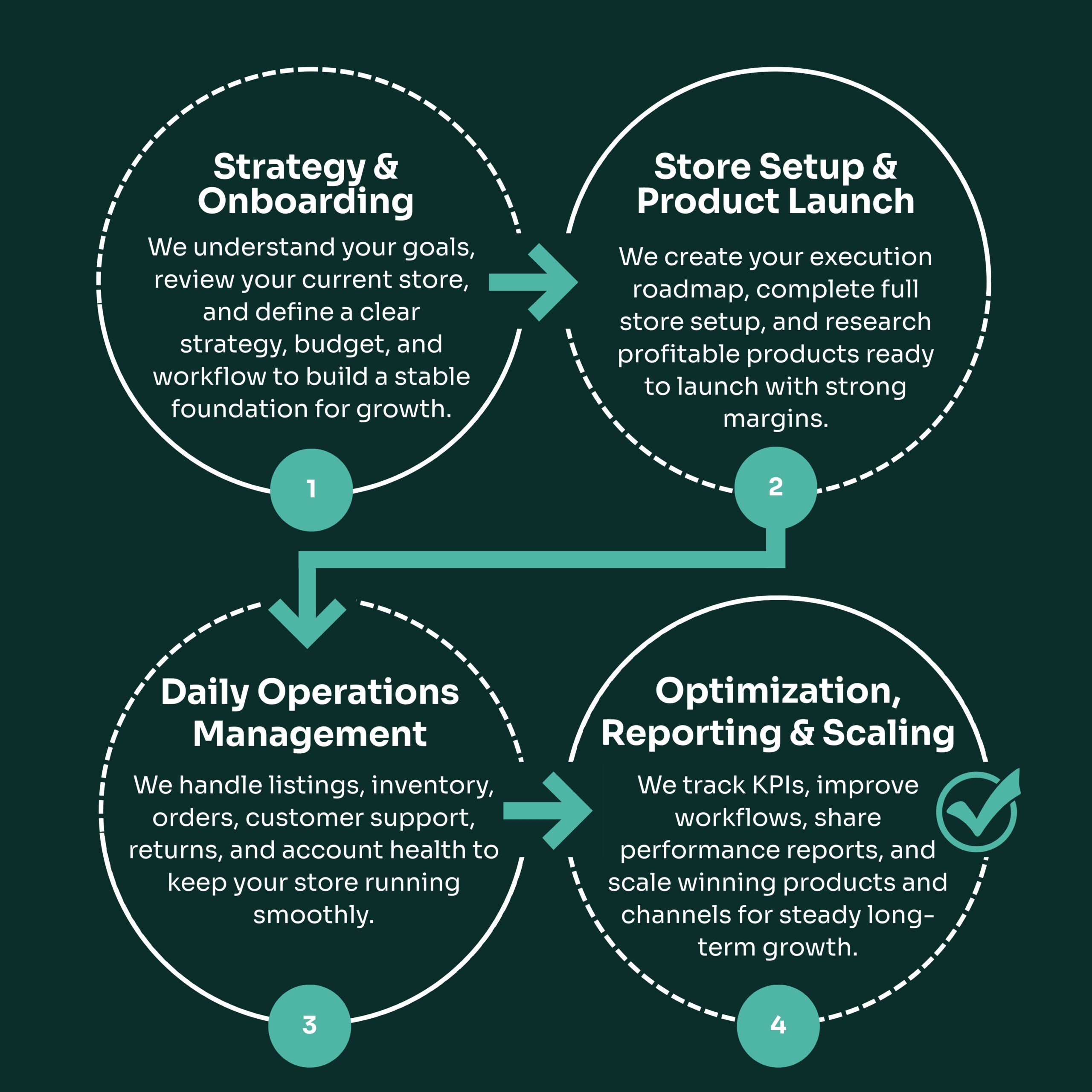 We manage setup, product strategy support, listings, inventory workflows, order processes, customer workflows, and ongoing optimization based on the service you choose.