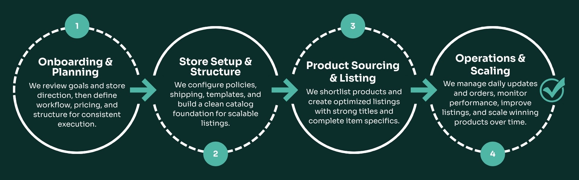 Done for you eBay store setup and daily management product workflow, listing optimization, order processes, and ongoing performance improvements managed by ECOM4X.