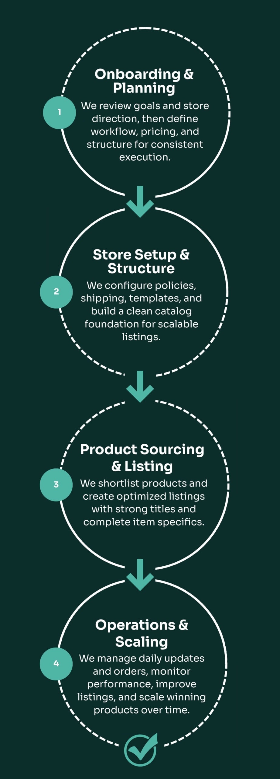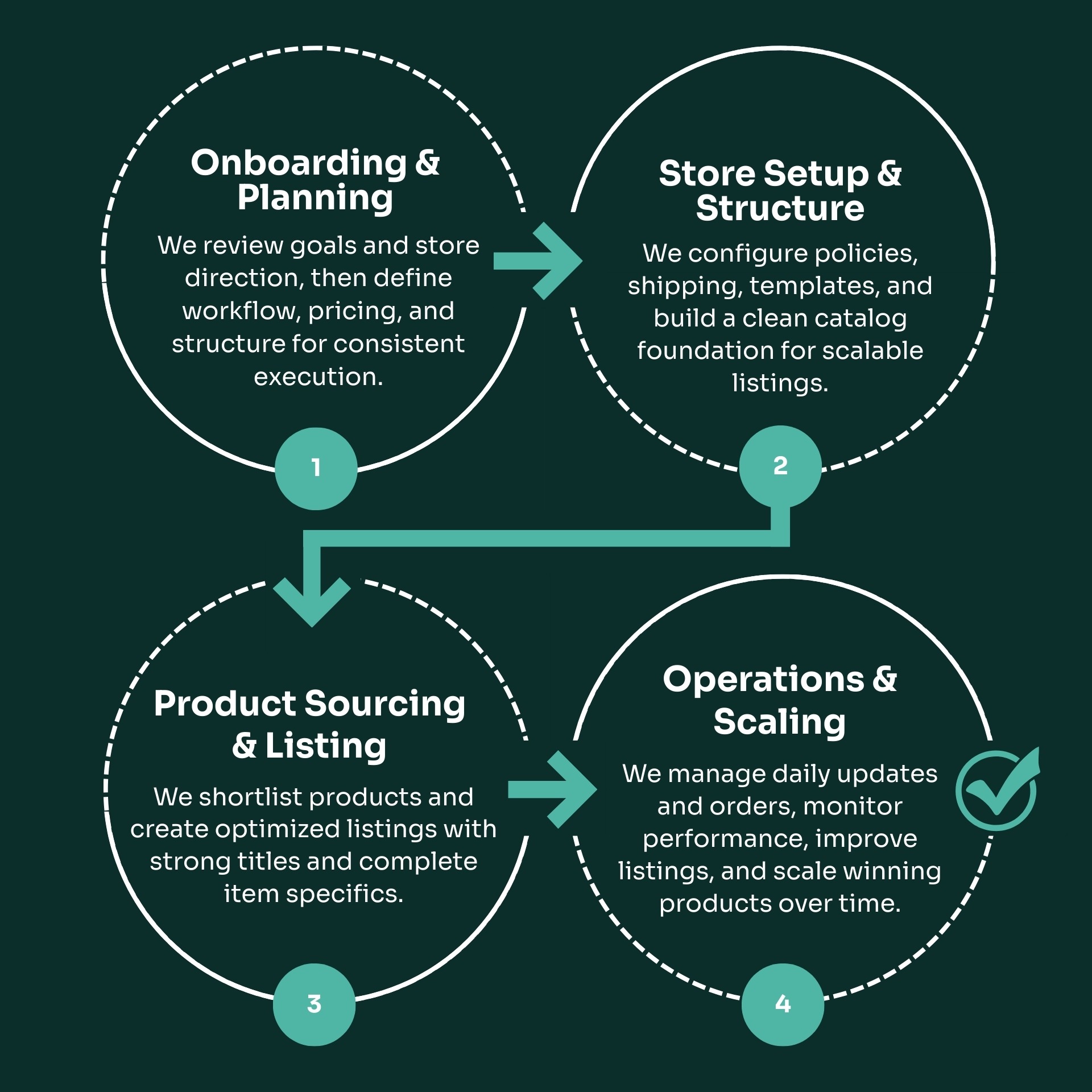 Store setup • Product workflow • Listing optimization • Order workflow • Returns support • Monthly KPI reporting