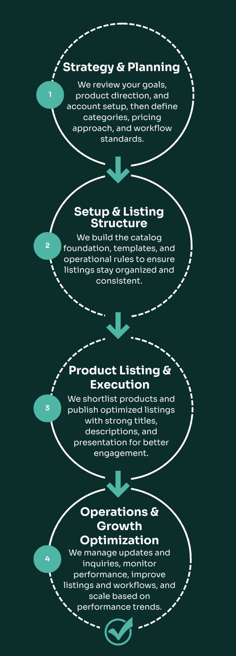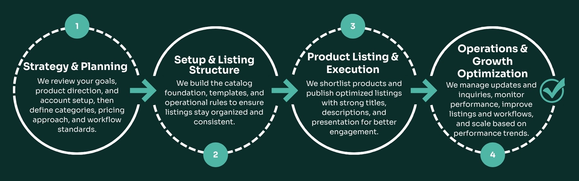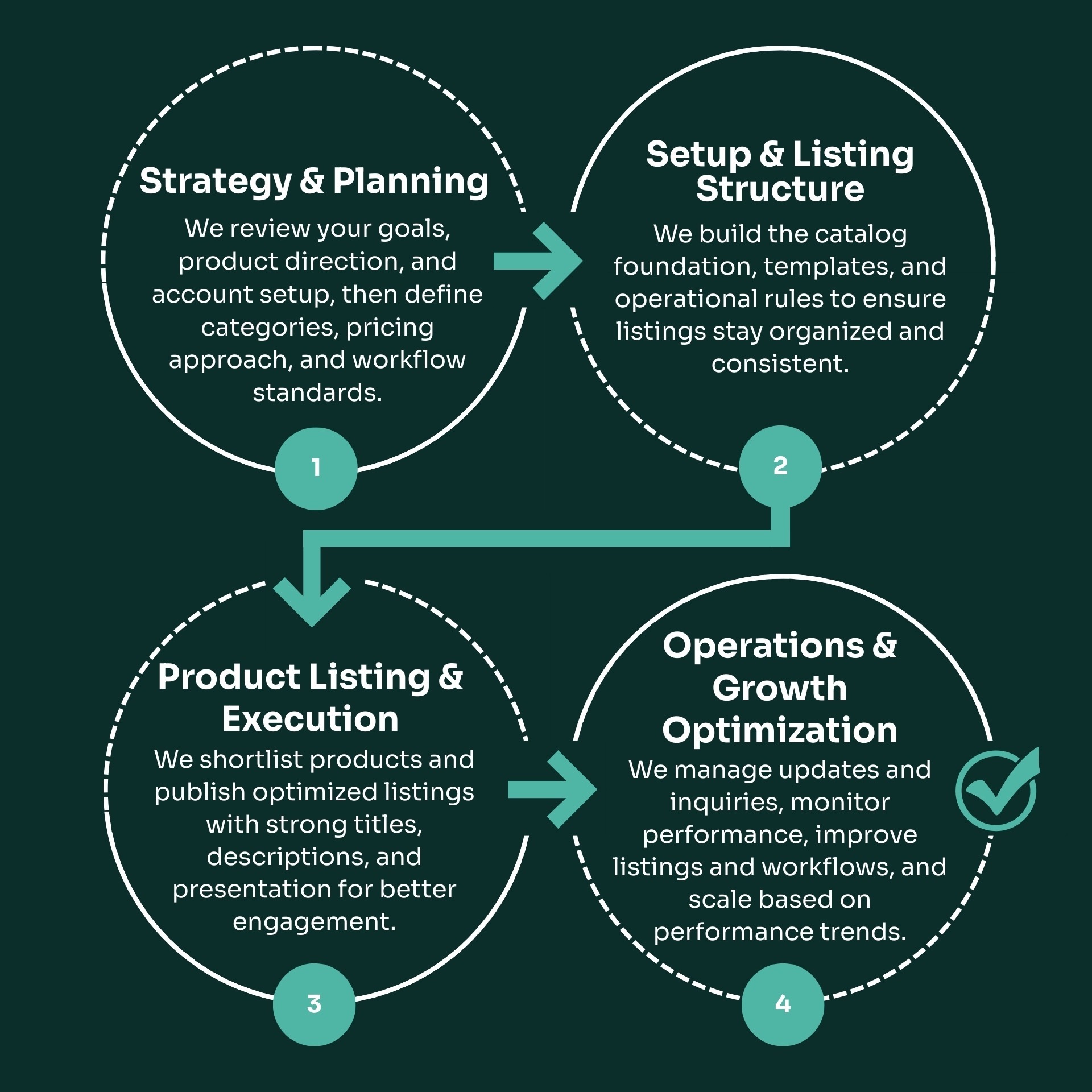 Listing setup • Product workflow • Messaging workflow • Order tracking support • Catalog optimization • Monthly KPI reporting